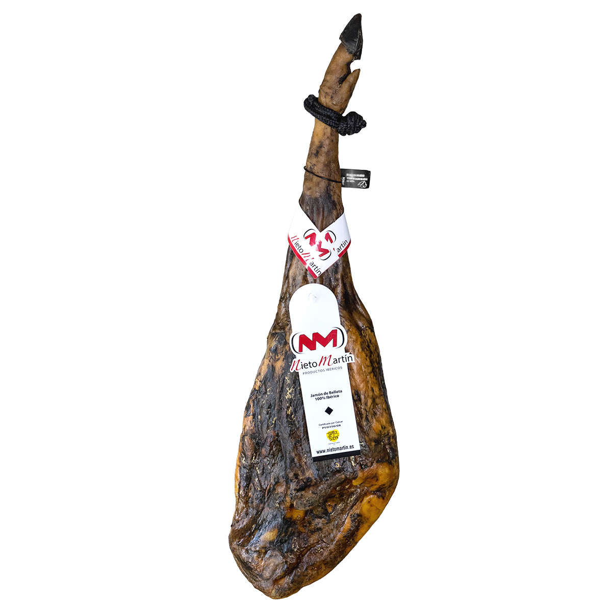 Este Jamón de Bellota 100% ibérico procede de las extremidades traseras de Cerdos Ibéricos con un 100% de raza ibérica certificada. Durante la montanera disfrutan de una alimentación basada principalmente en las bellotas de los árboles del genero Quercus (encinas, robles y alcornoques) que consiguen campeando en semi libertad por las dehesas de Andalucía, Extremadura y Salamanca.